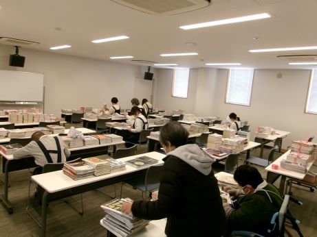 蔵書点検の合間に毎年12月に希望する方に差し上げる雑誌の除籍作業の様子です。
