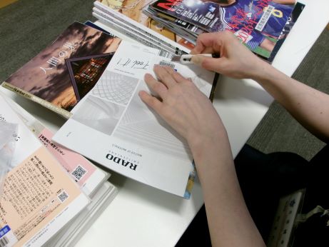 雑誌に付いたバーコードをはがす作業中!